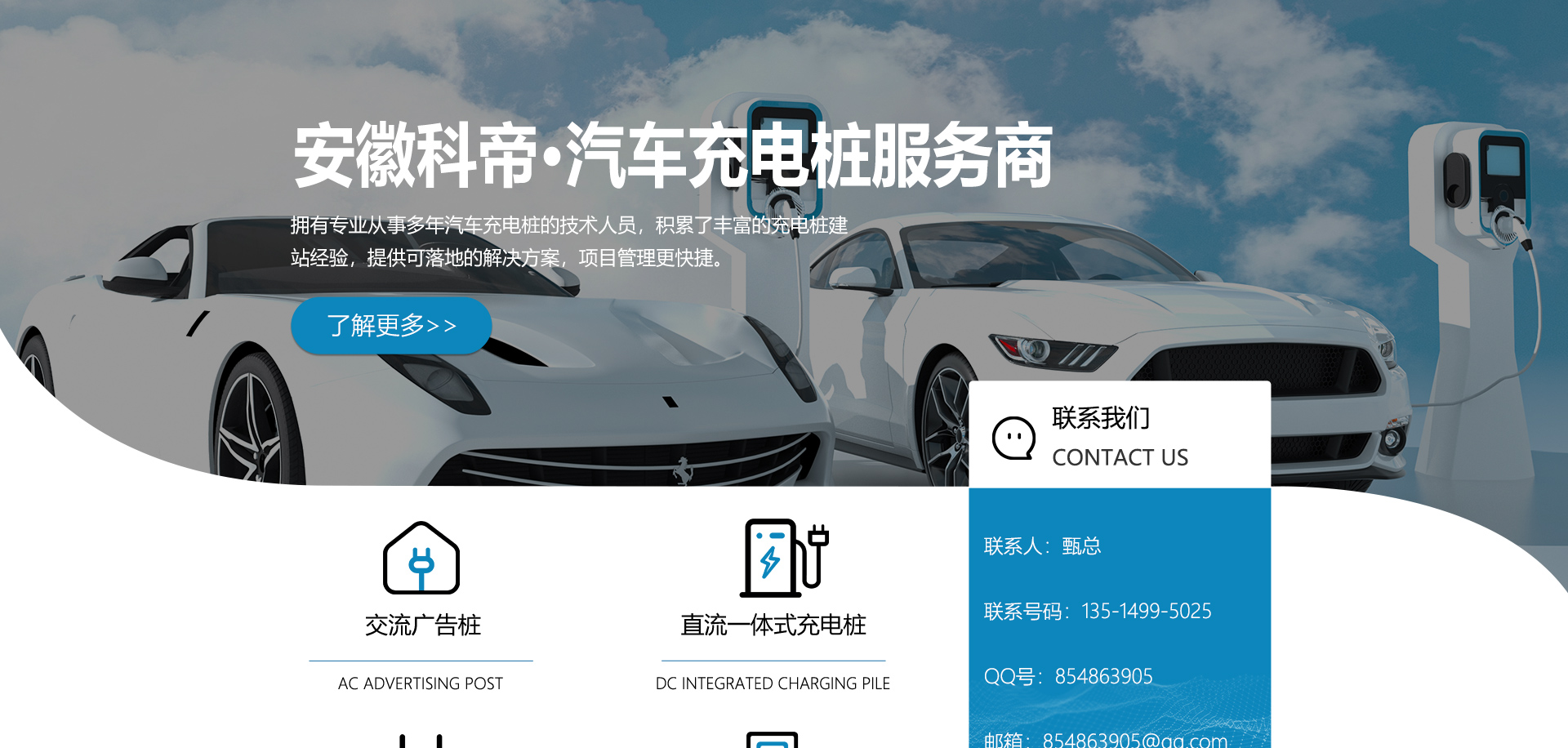 安徽科帝新能源科技有限公司坐落于安徽省會-合肥,是一家研發、生產智能充電樁設備,汽車充電站后臺監控管理系統和生產高壓開關設備的企業.由專門的研發團隊、管理團隊按照現代化企業制度規范設立的有限責任公司。致力于為能源智能、安全的應用和節能減排提供整體的技術與產品解決方案??频奂邪l、設計、生產、銷售以及服務于一體,在電動汽車充電方案,充電設施建設和城市配電方面擁有廣泛的技術研究及經驗積累,為客戶提供安全、智能的充電設備及充電運營站建設一體化解決方案。并堅持以人為本、質量為先、顧客至上、不斷創新”的企業理念,為能源行業的發展、節能減排做出重大的貢獻。公司擁有豐富的產品種類,目前科帝已研發生產了三十多種產品,充電設備有直流一體式充電樁、直流分體式充電樁、直流廣告樁、交流廣告樁、廣告一體樁、壁掛交直流樁;等多種充電設備;每一款產品都是精心打造,力求為客戶提供優越的用戶體驗。展望未來科帝將通過持續的自...